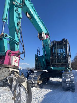 少しづつグラップル(爪のような形状で木を掴むことに特化した建機)で降ろすには大変です。